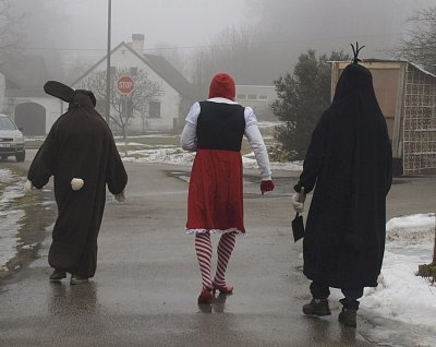 Obcházíme stavení. Rozdáváme koláče, bábovku, koblížky ... Na oplátku ochutnáváme zase jiné dobroty. Široký z toho dostal žízeň, Bystrozraký (vlevo) všechno vidí a Dlouhý (vpravo) přemýšlí, kterým směrem se vydat ....